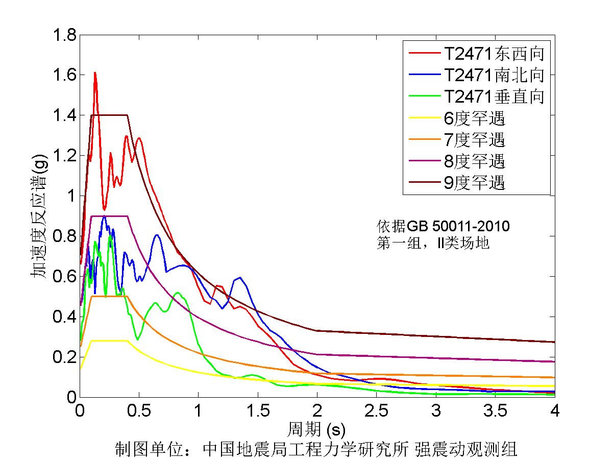 此次獲取的記錄,距離震中最近的51LDJ臺震中距16.2公里,東西向峰值加速度超過0.32個重力加速度,儀器地震烈度8.7度,T2471臺震中距為28.3km,東西峰值加速度超過0.64個重力加速度,儀器地震烈度9.1度。