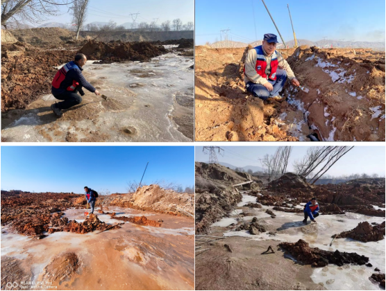 12月22日,在所領(lǐng)導(dǎo)的指示下,我所袁曉銘團(tuán)隊成立了專門的液化調(diào)查組,組長為陳龍偉研究員,組員聶桂波研究員、王永志研究員、汪云龍副研究員、李兆焱副研究員和張昊宇副研究員。于12月23日早奔赴地震現(xiàn)場,重點考察中川鄉(xiāng)的震害問題。12月24日,調(diào)查組經(jīng)過一天的艱苦調(diào)查,在此次地震流滑區(qū)上游發(fā)現(xiàn)了非常顯著液化現(xiàn)象(圖4),大規(guī)模液化分布在上游兩個區(qū)域內(nèi)(圖5)。結(jié)合考察組掌握的以往震害經(jīng)驗,判斷流滑區(qū)震害是上游發(fā)生大規(guī)模液化并導(dǎo)致長距離液化流滑所致,得出液化流滑是中川鄉(xiāng)震害誘因的結(jié)論,并向中國地震局甘肅積石山6.2級地震科考指揮部報告。