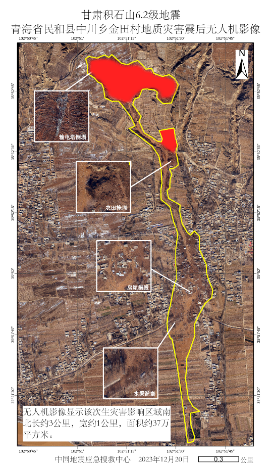 發(fā)布時間: 2023-12-25 點擊數(shù)量:72002023年12月18日23時59分,甘肅省臨夏積石山縣發(fā)生6.2級地震。此次地震已造成部分房屋損毀甚至倒塌,并由此造成人員傷亡。除房屋倒塌外,此次地震在青海省海東市民和縣中川鄉(xiāng)金田村和草灘村引發(fā)了被稱之為“砂涌”的特殊現(xiàn)象,區(qū)域內(nèi)部分房屋被厚達(dá)數(shù)米的流滑土壤掩埋(圖1)。