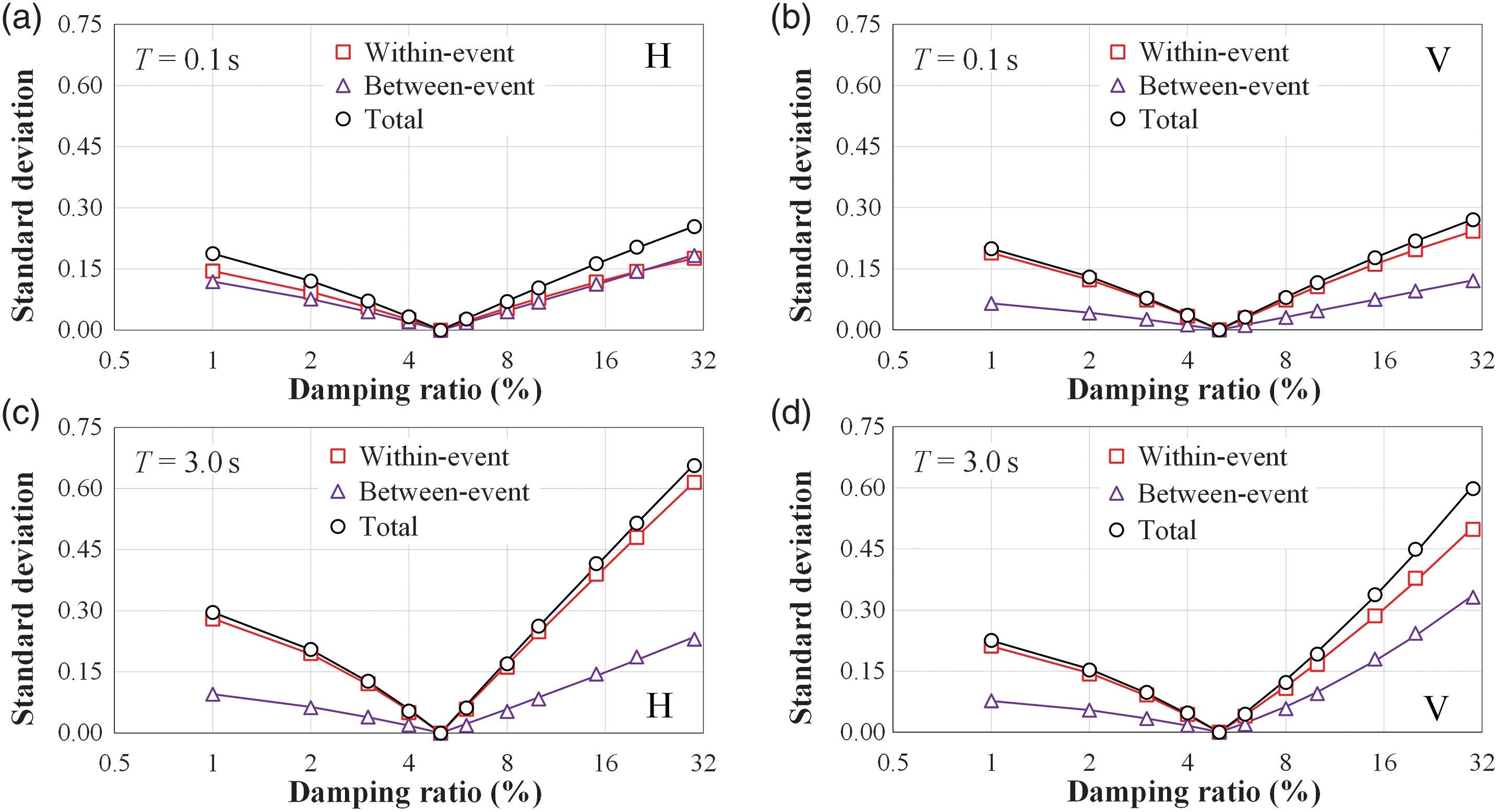 (4)阻尼比為1%時的所有標(biāo)準差都小于阻尼比為30%時的標(biāo)準差。總標(biāo)準差與事件內(nèi)標(biāo)準差接近,表明DMF模型的不確定性主要取決于震源效應(yīng)以外的效應(yīng)。豎向DMF的標(biāo)準差略小于水平向DMF的標(biāo)準差。