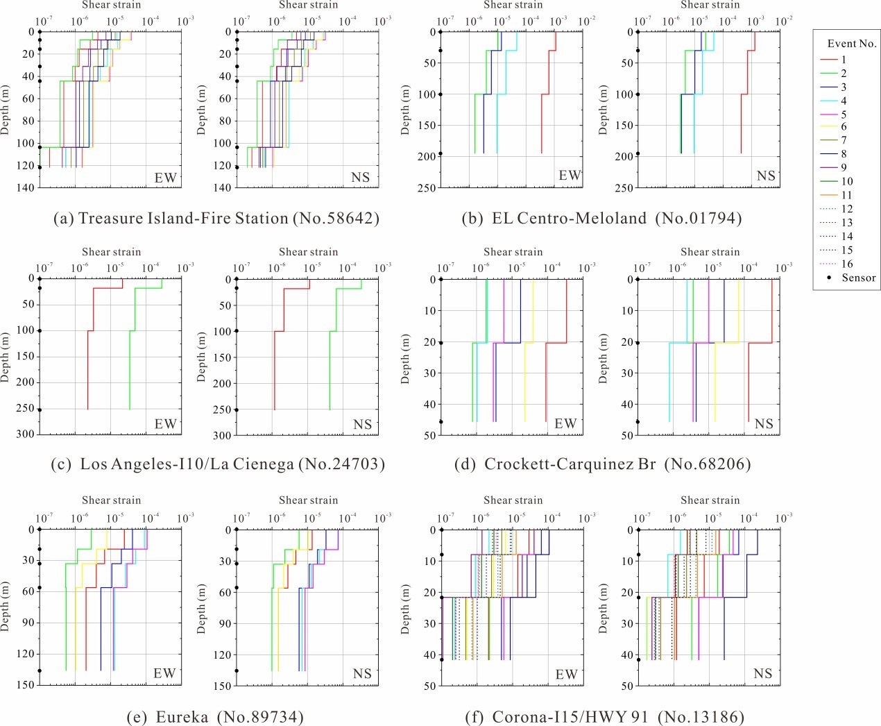 圖1. 本研究建立的6個巖土臺陣分別在EW和NS的剪切應變剖面。